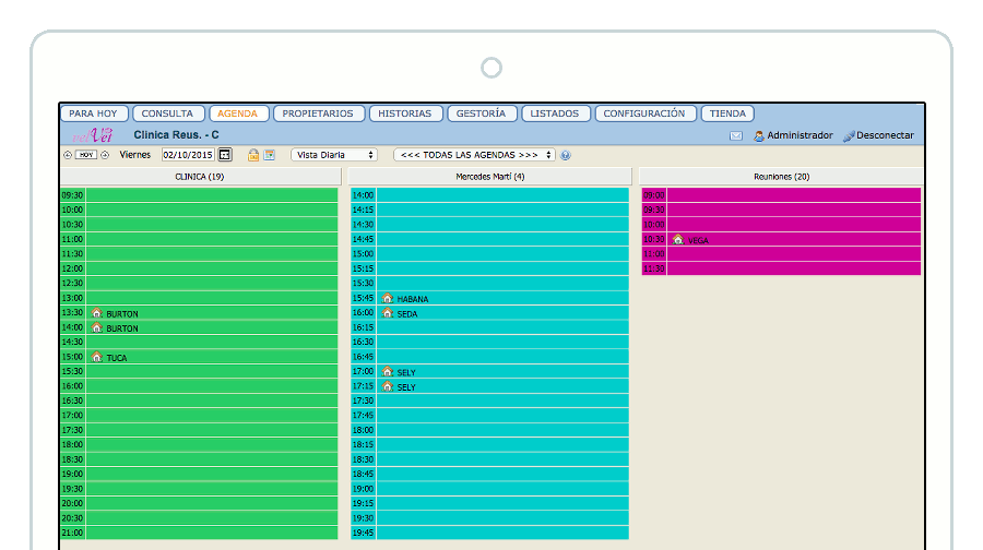 La agenda de la clínica nos permite gestionar y planificar las visitas de los propietarios y mascotas. Dispone de herramientas tan diversas como: vista diaria, vista semanal, grupos de agenda, buscador de visitas, envío de SMS, bloqueo de agendas, etc. También nos permite personalizar los tramos horarios, bloqueos o franjas horarias de cada agenda.