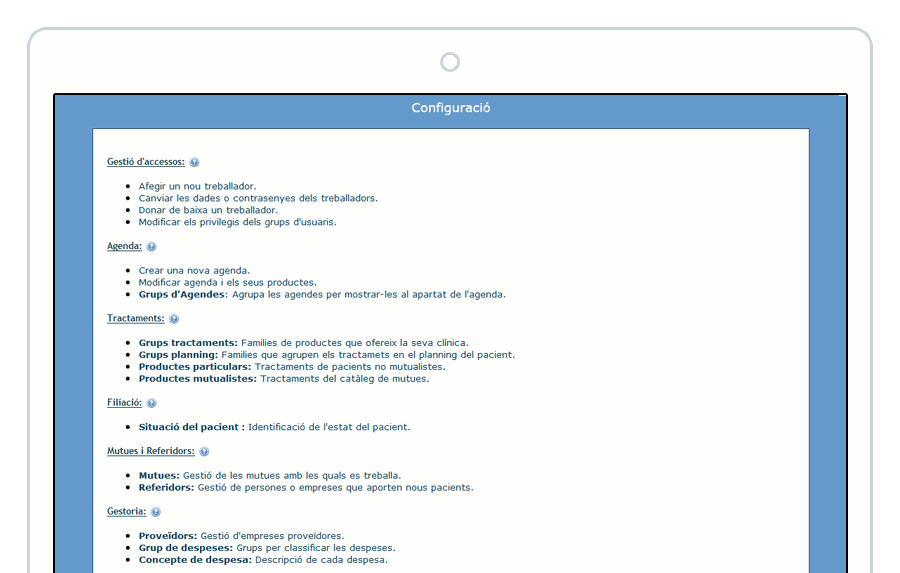 Centraliza toda la configuración de velVet. Todos y cada uno de los apartados del programa son configurables desde este menú. Puede modificar los precios de los tratamientos, horarios de las agendas, los datos de sus proveedores, etc...