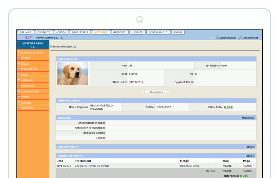 La historia incluye todos los apartados relativos a la historia médica de la mascota tales como: historial de visitas y vacunaciones, presupuestos, editor de cartas, facturación, imágenes, etc.