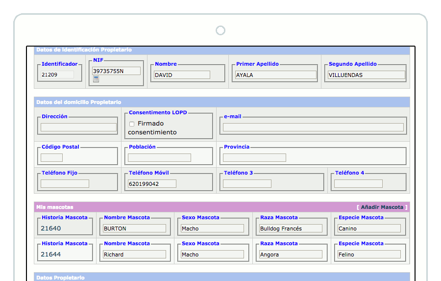 Desde la ficha de propietario también podemos acceder y gestionar sus mascotas así como añadir de nuevas.